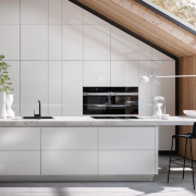 BOSSA Echtholzfronten und innovative Nanotech-Material FENIX F 45-C kombiniert. Die grifflosen Hochschrankmodule mit Tablarauszügen und Einschubtüren sind mit der Echtholzfront BOSSA verkleidet. FENIX F 45-C macht jede Oberfläche exklusiv und sorgt für ein einzigartiges haptisches Erlebnis. FIOS, das modulare Regalsystem, ist als freihängendes Wandelement integriert. Betont wohnlich spielt sich der Kochbereich visuell an beiden Küchenzeilen ab. So fügt sich durchdachtes Küchendesign von LEICHT stilsicher in architektonisch anspruchsvollste Wohnbereiche ein.